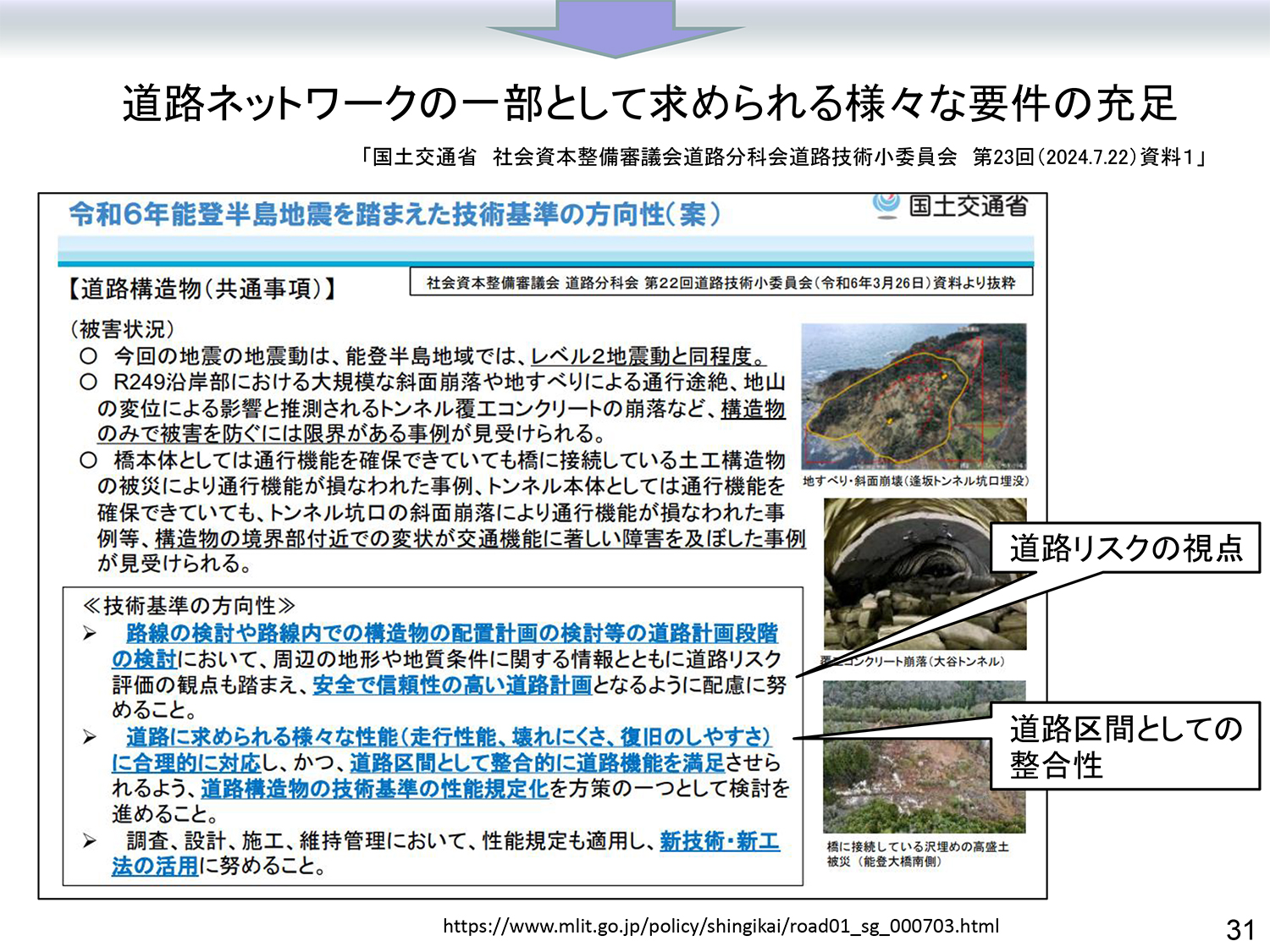 玉越道路構造物機能復旧研究官 日本の道路行政、道路橋の技術基準がどう進化してきているのかということが、驚くほど実務者や大学の先生に浸透していません。どういう経緯で、どういう災害を受けたり、三大損傷があったり、いろんなことがある中で、一方で新しい技術も上手に使っていかなければいけない。その中で、今までどういうふうに基準が変わって、中身が進化してきたかということがうまく浸透してこなかったところがあるように思います。