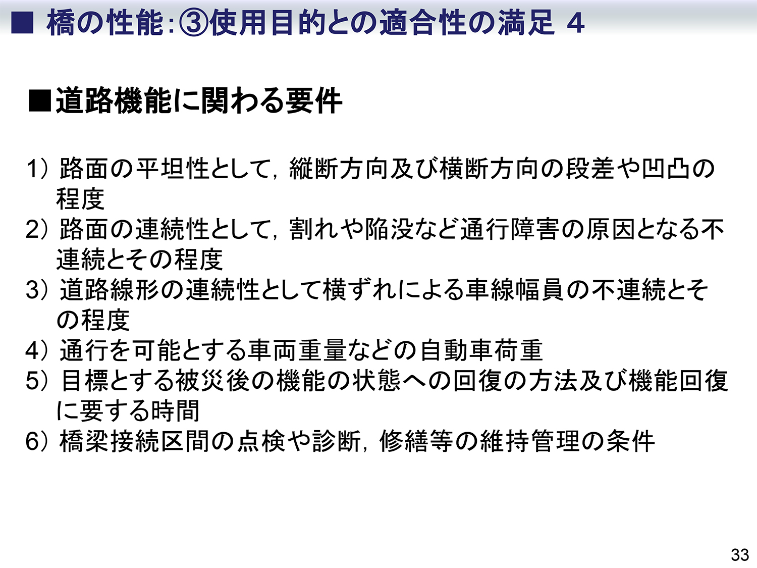 では、橋が備えるべき性能とは何なのか?ということになるのですが、例えば、日常的な荷重に対しては弾性範囲内にとどまってそのまま使い続けられるようにしてほしい。稀にしか遭遇しない極端な状況に対しては、限定的な損傷にとどまって復旧可能であればよい。といったことが本質的には道路橋に求められている。そうであれば、道路橋は道路機能を提供するためのものですから、どんな状況のときに道路がどういう形で使えるのかが道路橋の備えるべき性能として求められているととらえて、それがどの程度確実に達成できればよいかを技術基準は要求性能として規定すればよく、材料や手段を限定して規定しない方がよいのではないか、ということで性能規定化されてきたのです。
