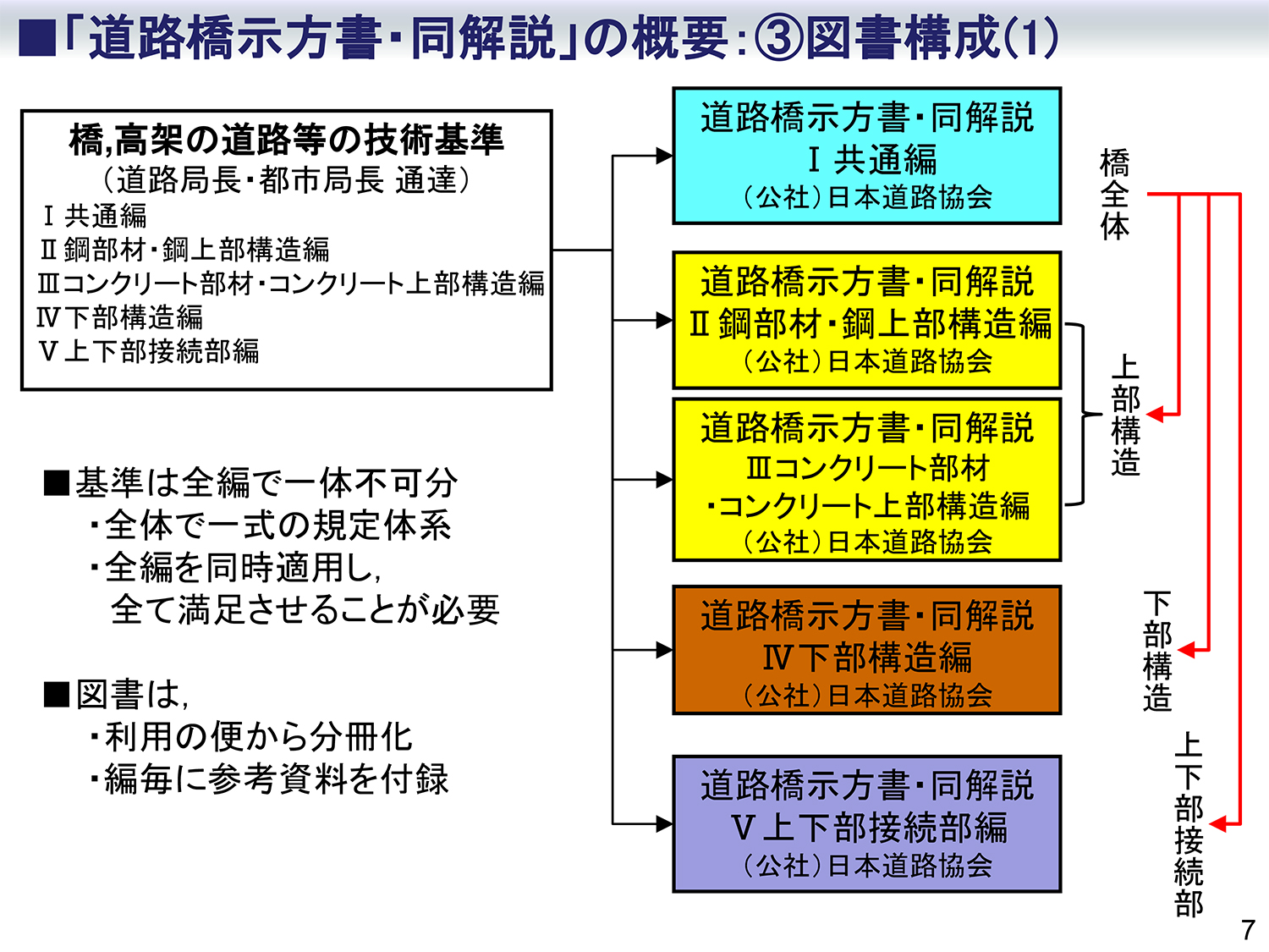 日本道路協会から解説を付して図書として出版される際には、利用の便から分冊化するとともに編ごとに参考資料などを付録としてつけることが行われてきましたが、図書では枠書きされている条文の全編分が一つの技術基準となっています。なお、Ⅰ共通編には橋全体に関わる要求性能や設計状況に関する規定がまとめられており、平成29年の部分係数化の際に導入された橋の基本構成要素である上部構造、下部構造、上下部接続部に対応して、Ⅱ・Ⅲ編が上部構造、Ⅳ編が下部構造、Ⅴ編が上下部接続部という構成です。