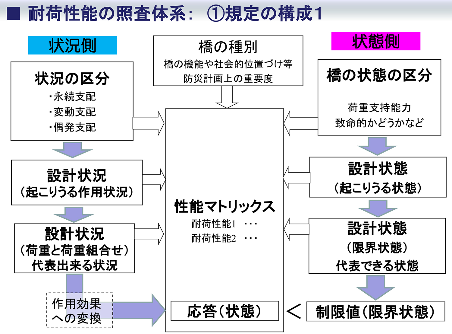 その後、特に大きかったのは平成29年の改定で性能マトリクスの形で部分係数とともに耐荷性能の要求を規定したことです。これによりどういう状況に対してどういう状態であればよいのかという橋全体に対する基本的な要求内容が初めて明確かつ普遍的な形で示されました。