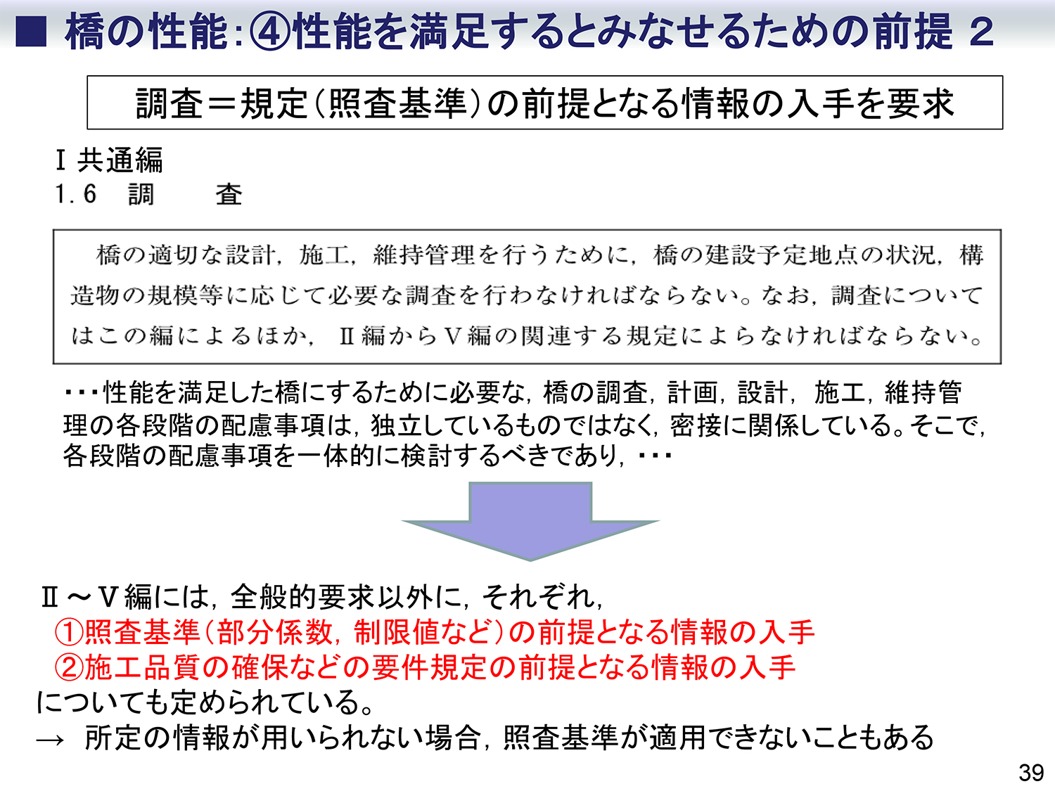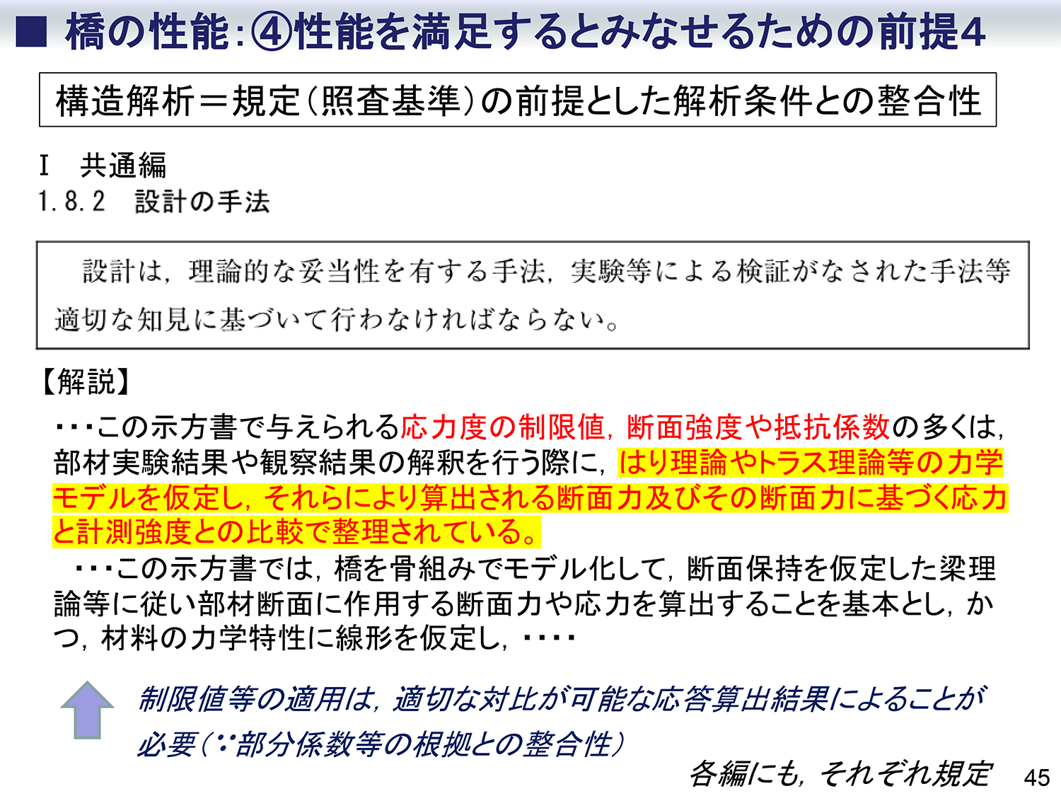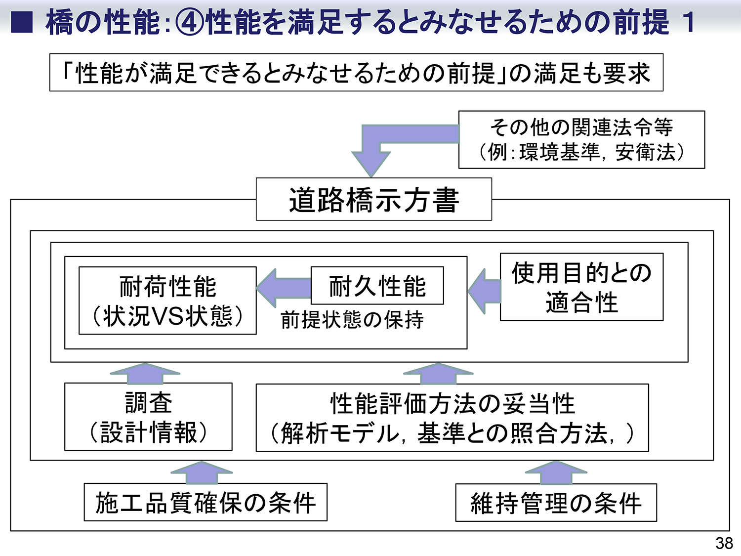 すなわち、それぞれの道路橋にどういう状況のときにどんな使い方ができるものにしたいというのは管理者の方で決められており、そのとき採用可能な性能のメニューは国が定めた技術基準には用意されているので、これを適用して選択した要求性能を満足する設計をコンサルタントに発注して成果を受け取るという構図です。そのため道路管理者が要求性能を判断できないとか、判断しないということは公共事業の制度からもありえないことです。