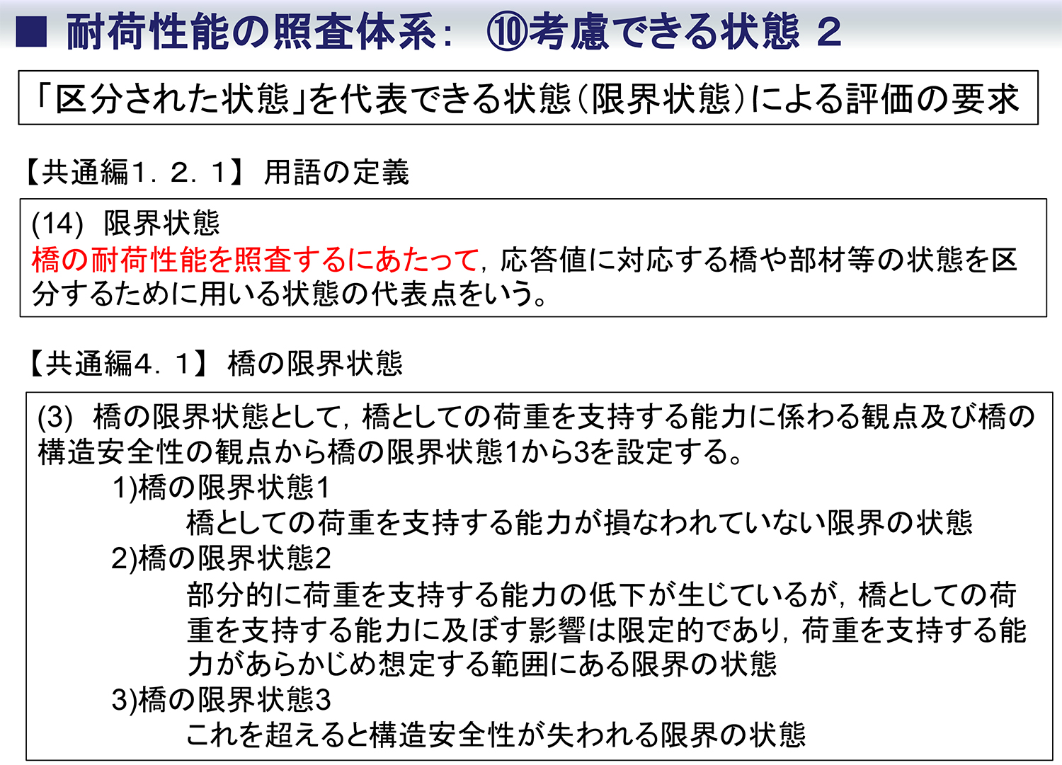 玉越 橋の限界状態として、橋としての荷重を支持する能力に関わる観点及び橋の構造安全性の観点から、橋の限界状態1から3を設定しています。