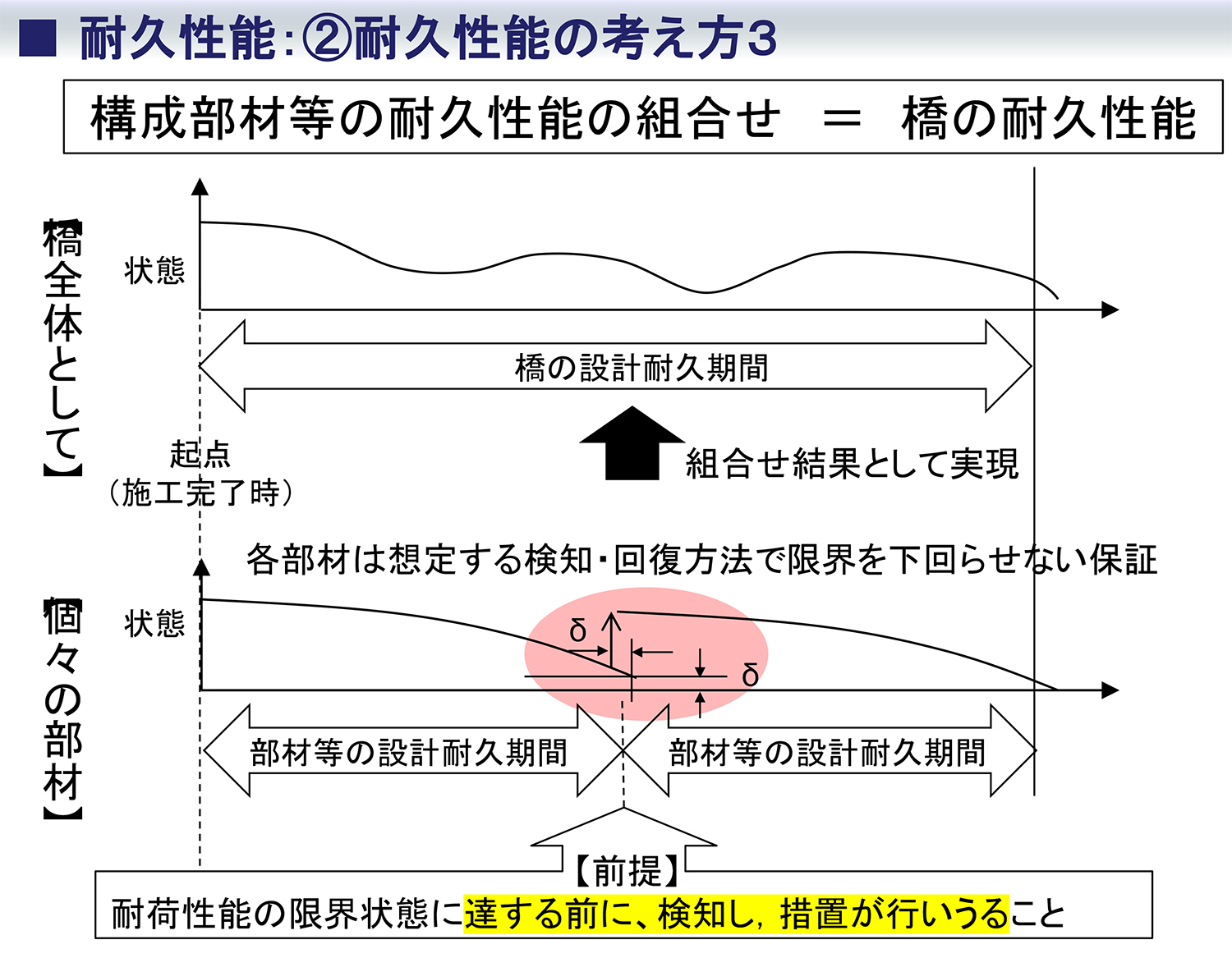 かといって、信頼性の乏しい材料や手段が安易に持ち込まれると、価格競争の中で耐久性の信頼性のないインフラが作られる危険性もあります。そのため、技術基準としてせめて耐久性能の定義を明確にするとともに、どのような考え方でどの程度の耐久性能が期待できると考えているのかくらいは設計時点で根拠も添えて明確にしてもらおうということなのです。