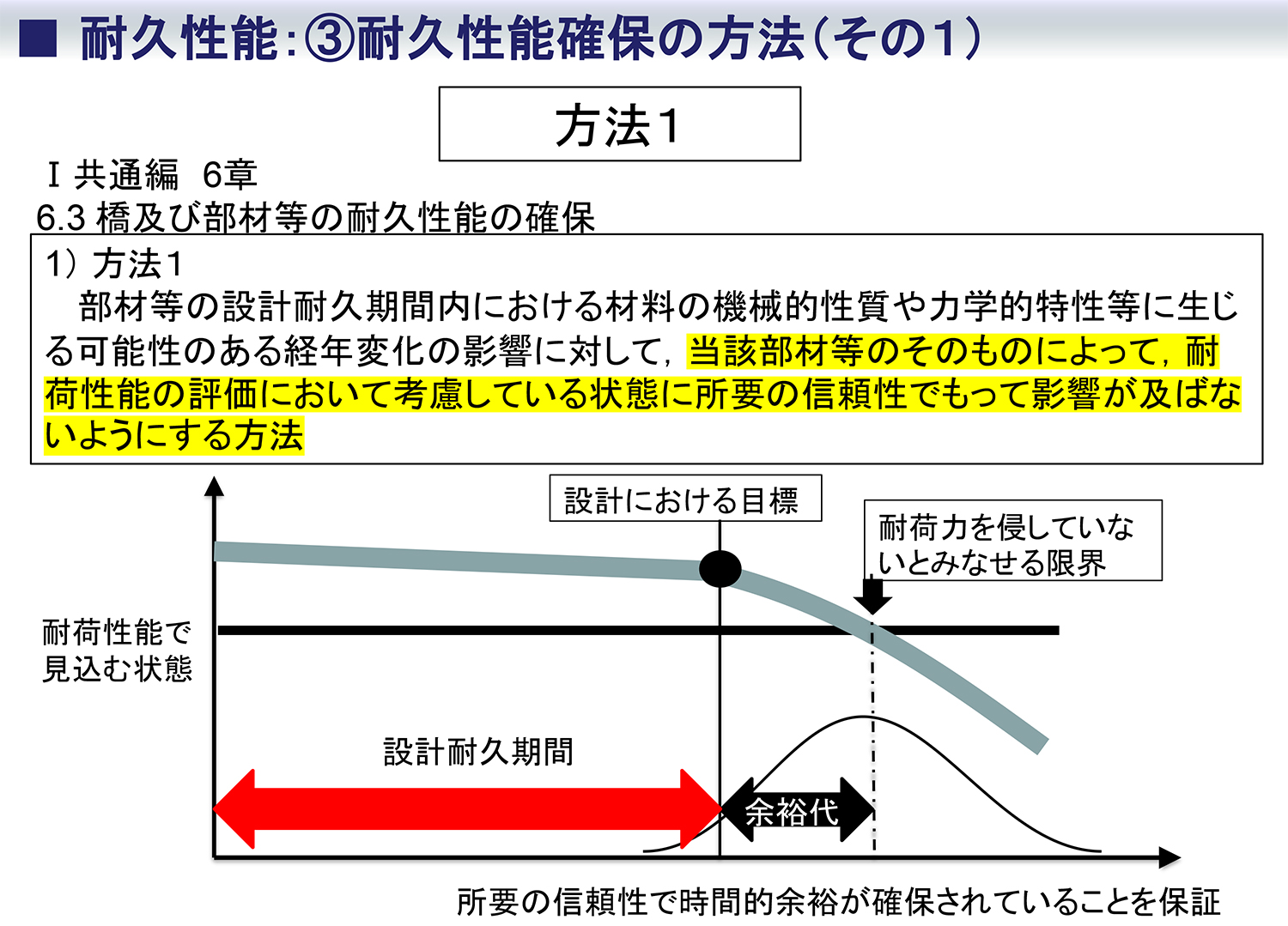 玉越 前回の改定では耐久性能の確保方法として方法1、2、3という3つの区分が導入されました。しかし、維持管理との関係などで少し曖昧なところがあるとの指摘もあったことを受けて見直しが行われています。具体的には、方法2のような耐久性確保のための措置が供用中に更新されることを想定する場合、耐荷性能が所要の水準を下回らないように確実に更新が行われるように設計の段階で十分配慮されることが求められました。
