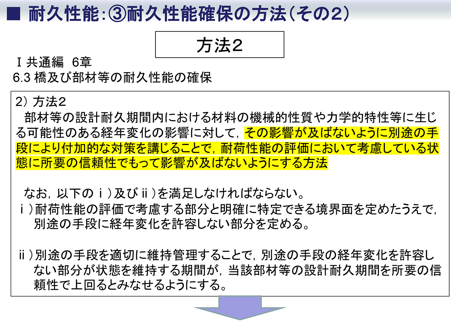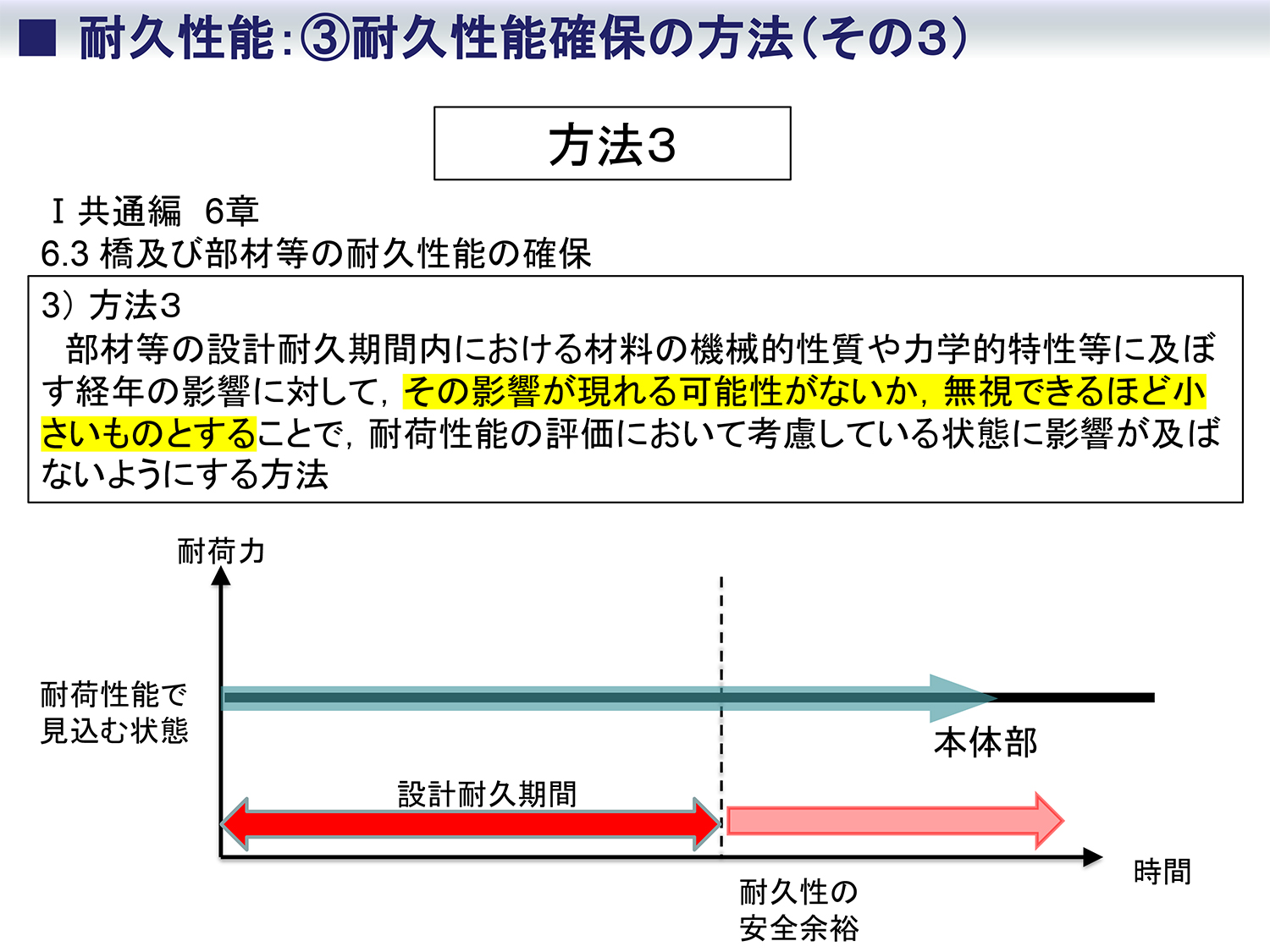 そして、今回の改定では、方法2とする以上は、母材に影響が及ぶことは許されませんので点検で「もうそろそろ危ない」と母材に影響が及ぶ前に確実に更新のタイミングであることを見つけて判断できること。さらに、母材を危険にさらすことなく耐荷性能が所要を下回らない段階で補修などで耐久性能の回復ができることが求められます。これらができなかったら絵に描いた餅になりますので、これらが定義にも反映されました。