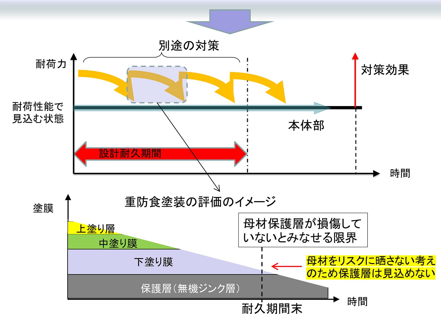 玉越 現在一般的な重防食塗装の場合、上塗り、中塗り、下塗りの順に上からダメになってきますが、その下にさらに犠牲防食効果のある無機ジンク層があります。母材を一切傷めるつもりがないという考え方ですから、これを方法2とする場合には、無機ジンク層に劣化が及ぶ前の下塗り塗装までの劣化で補修塗装を行うなど予防保全ができなければなりません。無機ジンク層で劣化が始まると確率的には母材にも腐食が生じる可能性がでてきていることになります。そのため方法2の場合、時間信頼性を考慮して劣化させる部分とは別に、母材に影響が及ばないための保護層のような役割を担うものを何か設けることになると思います。