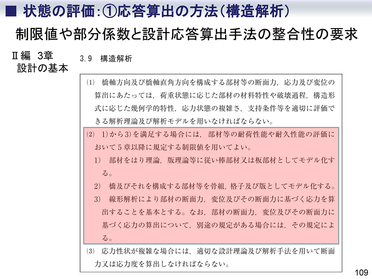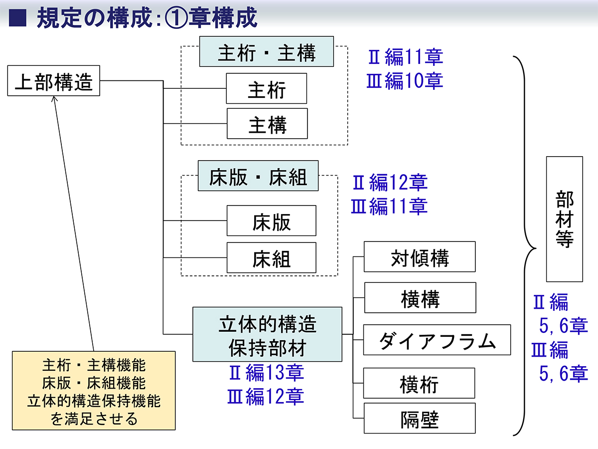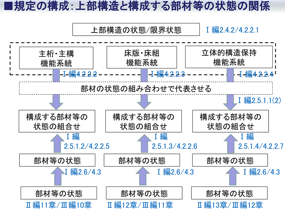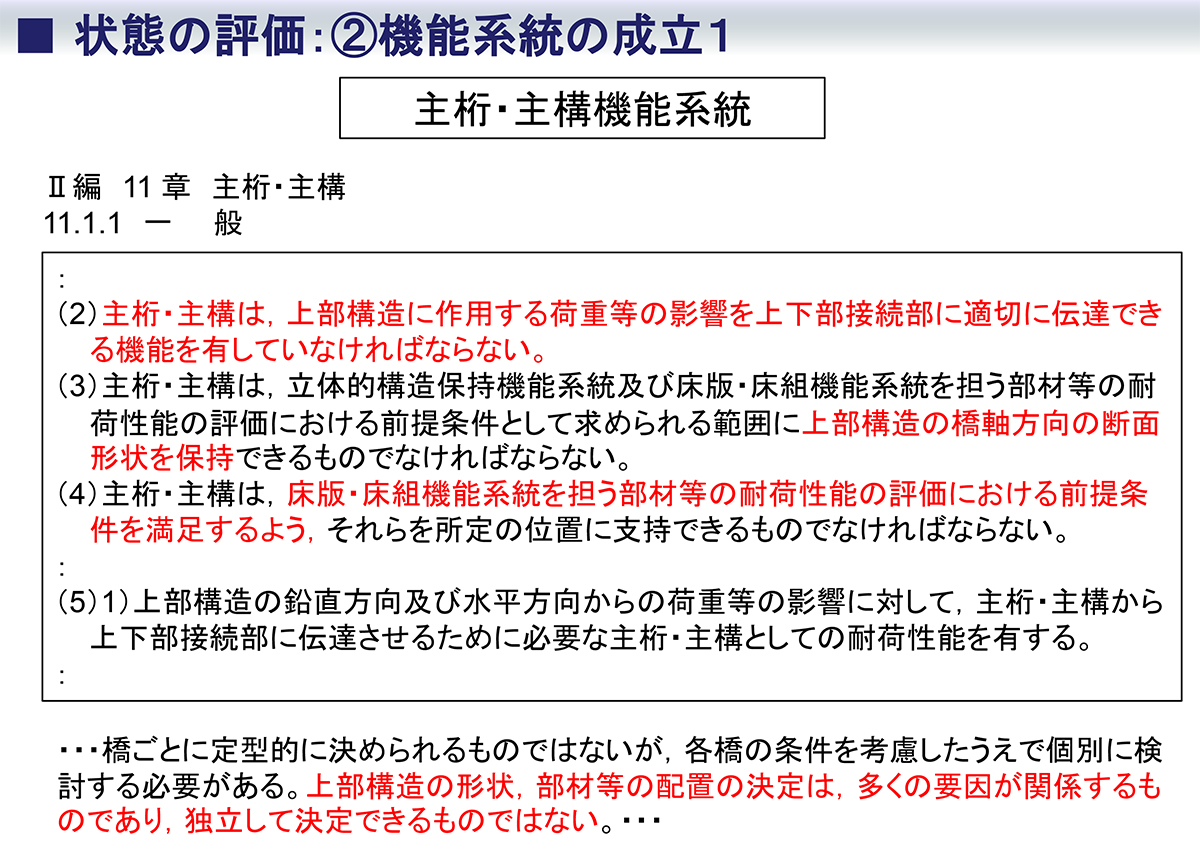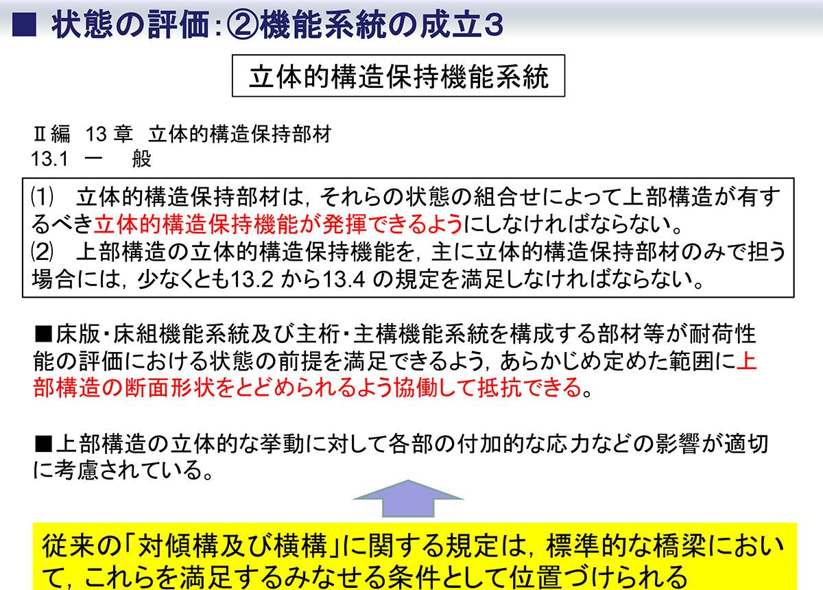 上部構造以外の下部構造や上下部接続部も同様です、各構造要素として所要の耐荷性能があると言えるためには、それぞれが橋の中で求められている役割が果たせる状態であることが前提条件として満足されなければならないことは当然なのですが、そのことを規定として盛り込んだのです。
