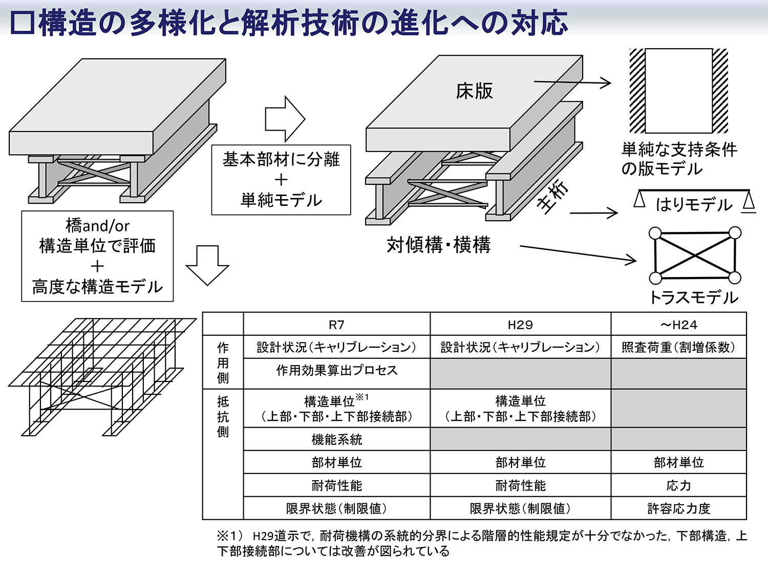 改定前は、例えば、対傾構や横構を設ける場合にはどういう構造でなければならないといったことが規定されていたのですが、それは、そもそも上部構造の立体的挙動を保証するためのものです。しかし、今回の改定で「立体的構造保持機能」と定義された立体的に挙動できる機能を上部構造は必ず有していなければならないということ自体は規定されていなかったのです。その結果、「対傾構や横構をなくしてしまえば、対傾構や横構がないのだから、それについて書いてある規定は無視すればいいんだ」といった解釈をする人がでてきました。