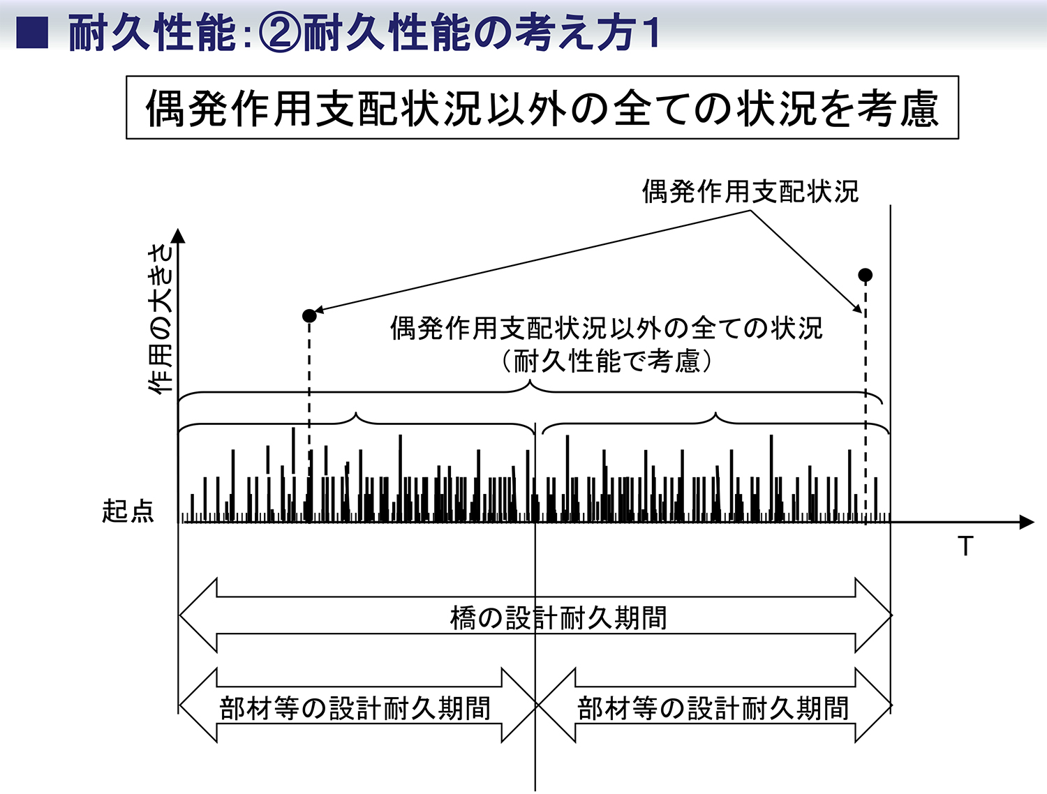 道路橋示方書で規定される耐荷性能は、例えば100年間を想定すると、その100年間のどのタイミングで地震などの想定する状況に遭遇していも、設計で期待した状態を実現できることを求めています。すなわち耐荷性能には時間という概念はなく想定する期間内のどの瞬間であっても成立していなければなりません。地震はいつ来るかわかりませんし、時間がたったからといって耐荷性能で期待した状態が実現しなくなってもよいということではありません。