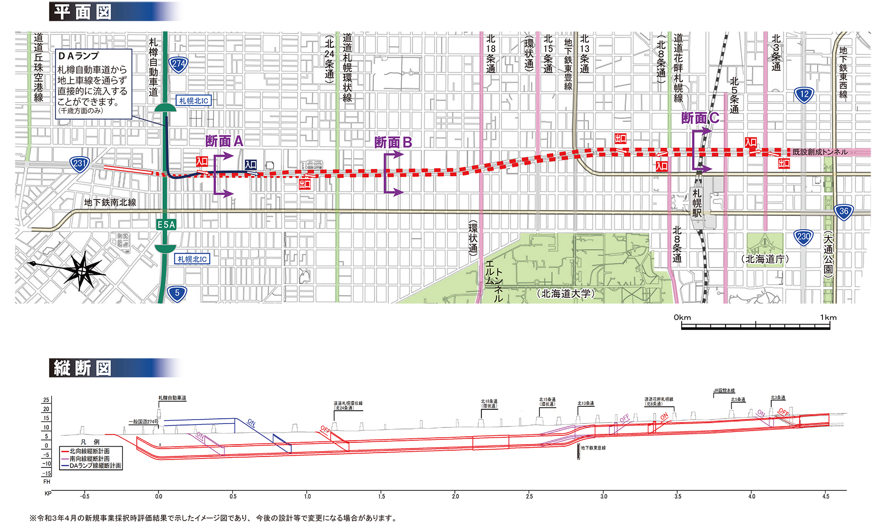 これは都心アクセス道路と呼んでいるもので、国内外から新千歳空港を利用して北海道入りされた方や、道内各地から札幌に来られた方が、札樽自動車道から専用のランプ橋で下り、地下トンネルを通って札幌駅等の都心部へ直接アクセスできるようになります。この事業の構造物比率は札樽自動車道からのランプ橋を含み、全線地下トンネル(ボックスカルバート)のため100%となっていす。