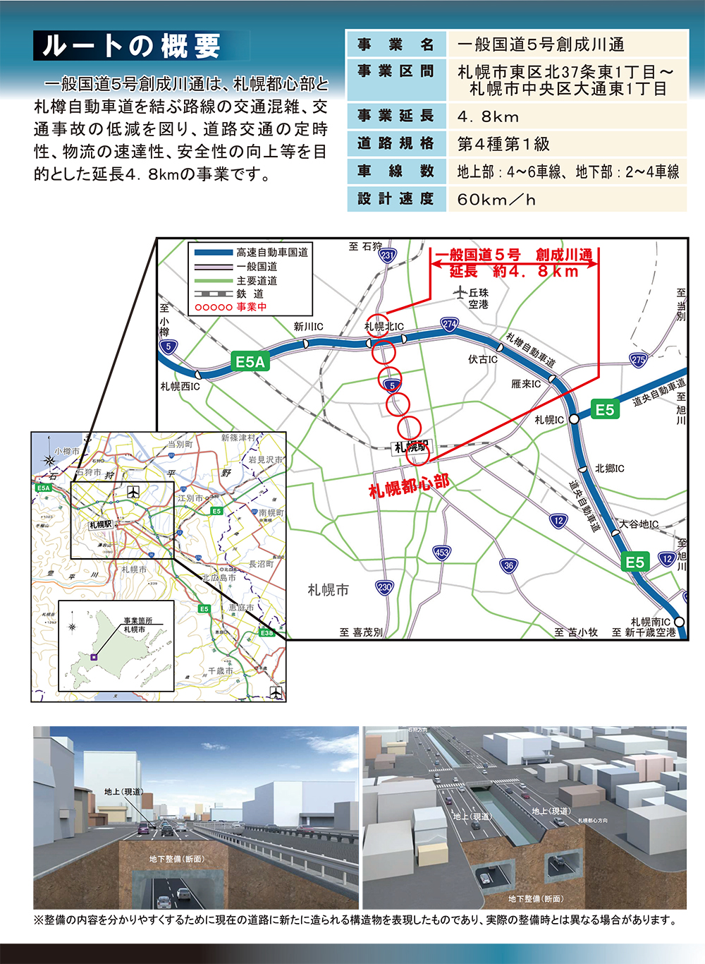 そして、令和7年度から本格始動する大きな事業として、国道5号創成川通事業があります。これは札幌市東区北37条東1丁目から中央区大通東1丁目までの延長4.8kmの事業で、令和7年3月末時点で事業進捗率は約8%となっています。これまで各種設計や協議を進めてきており、いよいよ令和7年度から工事着手を予定しています。