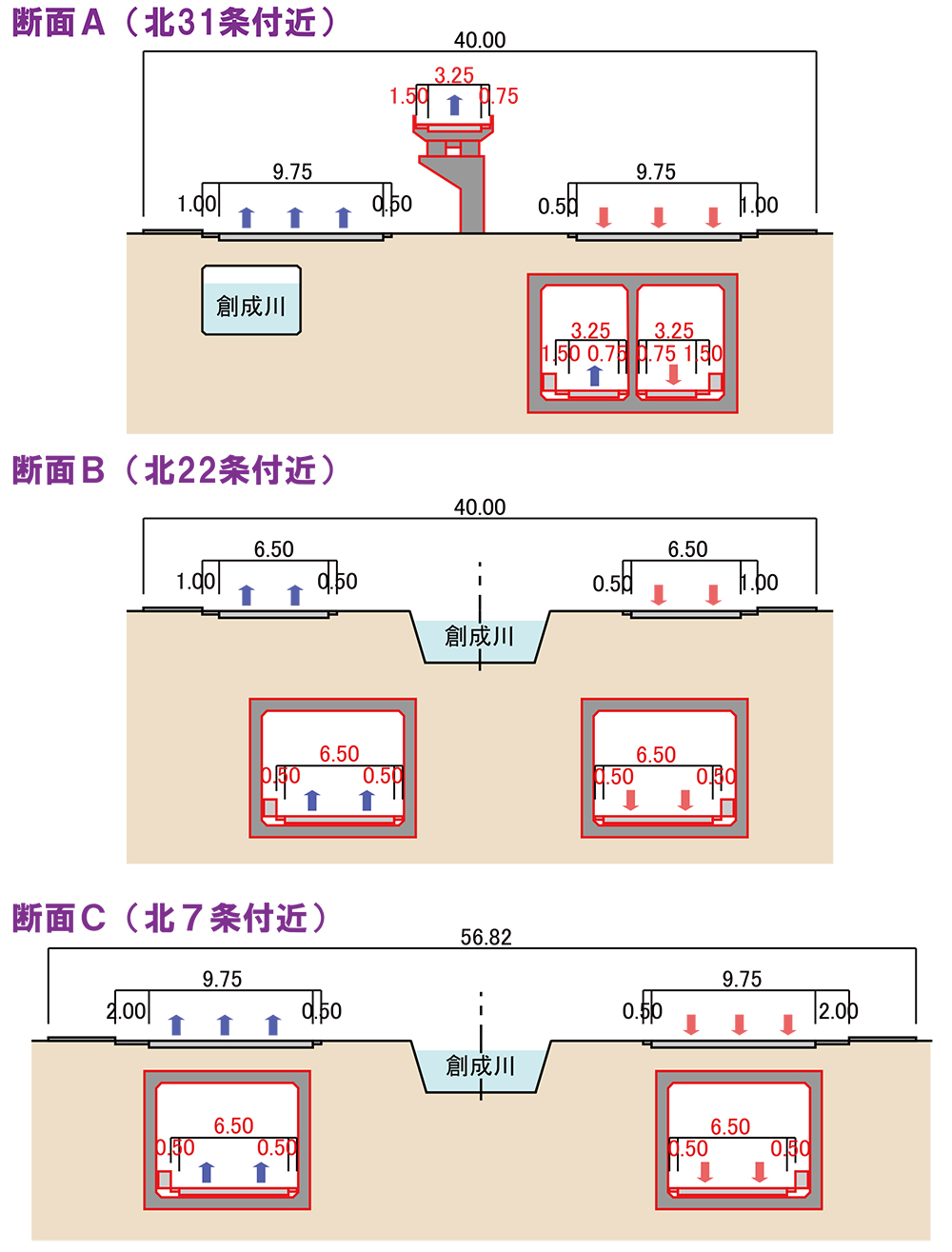 平山 国道5号創成川通は南北方向にそれぞれ車線があり、その中央に創成川が流れていますが、都市の発展等に伴う交通需要の変化により、都心部へのアクセス交通に対して渋滞等の課題が顕在化してきました。そのため、現在の道路下の地中にもう一つ、それぞれ2車線ずつの道路トンネルを新たに整備します。