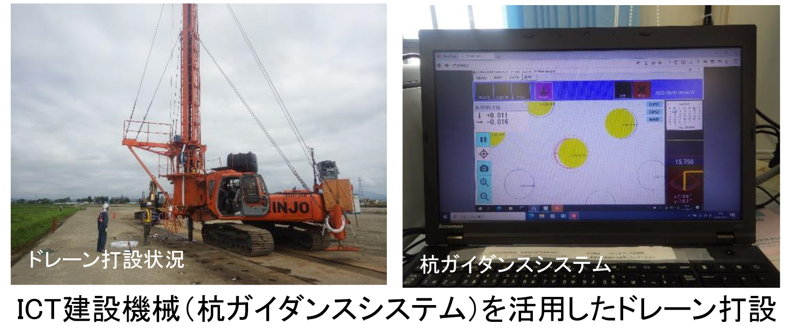 一つ技術をご紹介しますと、周囲堤整備箇所の地盤改良として真空圧密工法を採用しています。通常は盛土による自重で圧密沈下をかけますが、軟弱な地盤では圧密に時間がかかります。そこで、地盤にストロー状のものを埋めて地中の水を強制的に吸い上げ負圧をかけることで地盤を圧密させます。この圧密され沈下したところに盛土をするのですが、その際に、盛土の重さと水を吸引する力をうまく調整し、バランスを取りながら施工することで不等沈下を防いでいます。