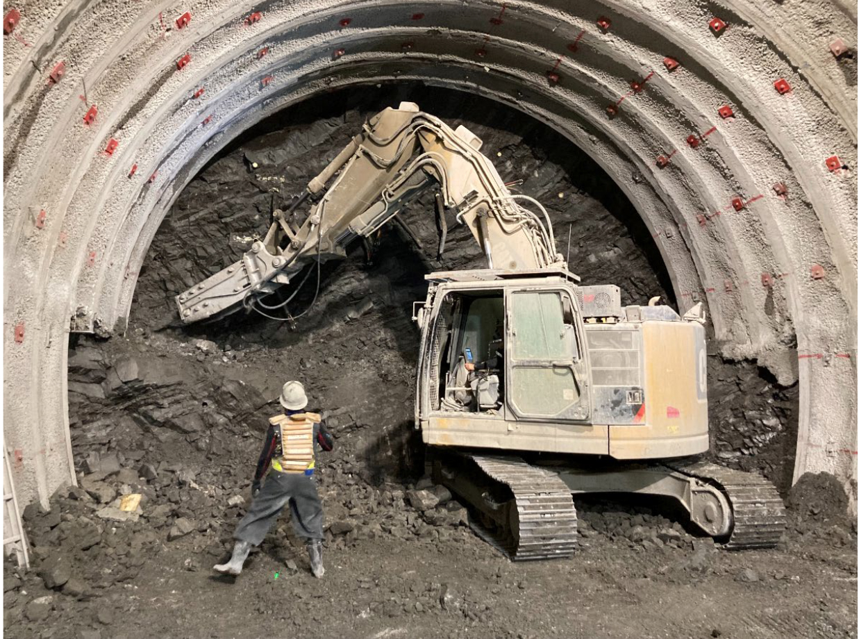 鏡トンネルが位置する日高山脈は、東西両側から押されて大きな圧がかかっているため、掘削すると切羽がボロボロ落ちてくるような状態です。そのため、AGFや鏡ボルト等のさまざまな補助工法を取り入れて掘削を進めています。現在の進捗は坑口側から8割ぐらい進んでいます。