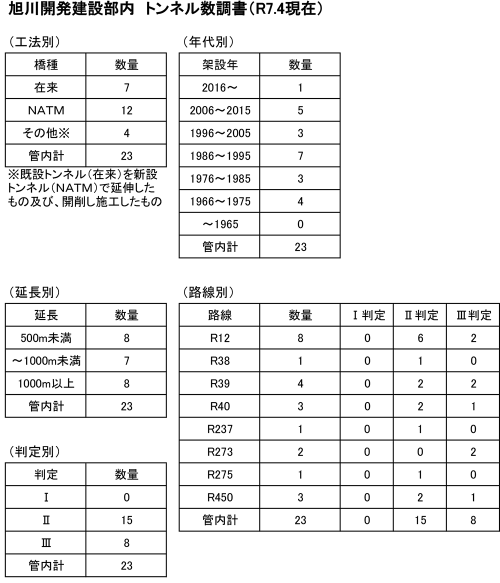 50年以上経過したトンネルは、国道39号の新大函トンネル延長573m、大雪トンネル延長320m、国道237号の金山トンネル延長456m、国道273号の樹海トンネル延長685m、全て在来工法で山岳(矢板)工法です。