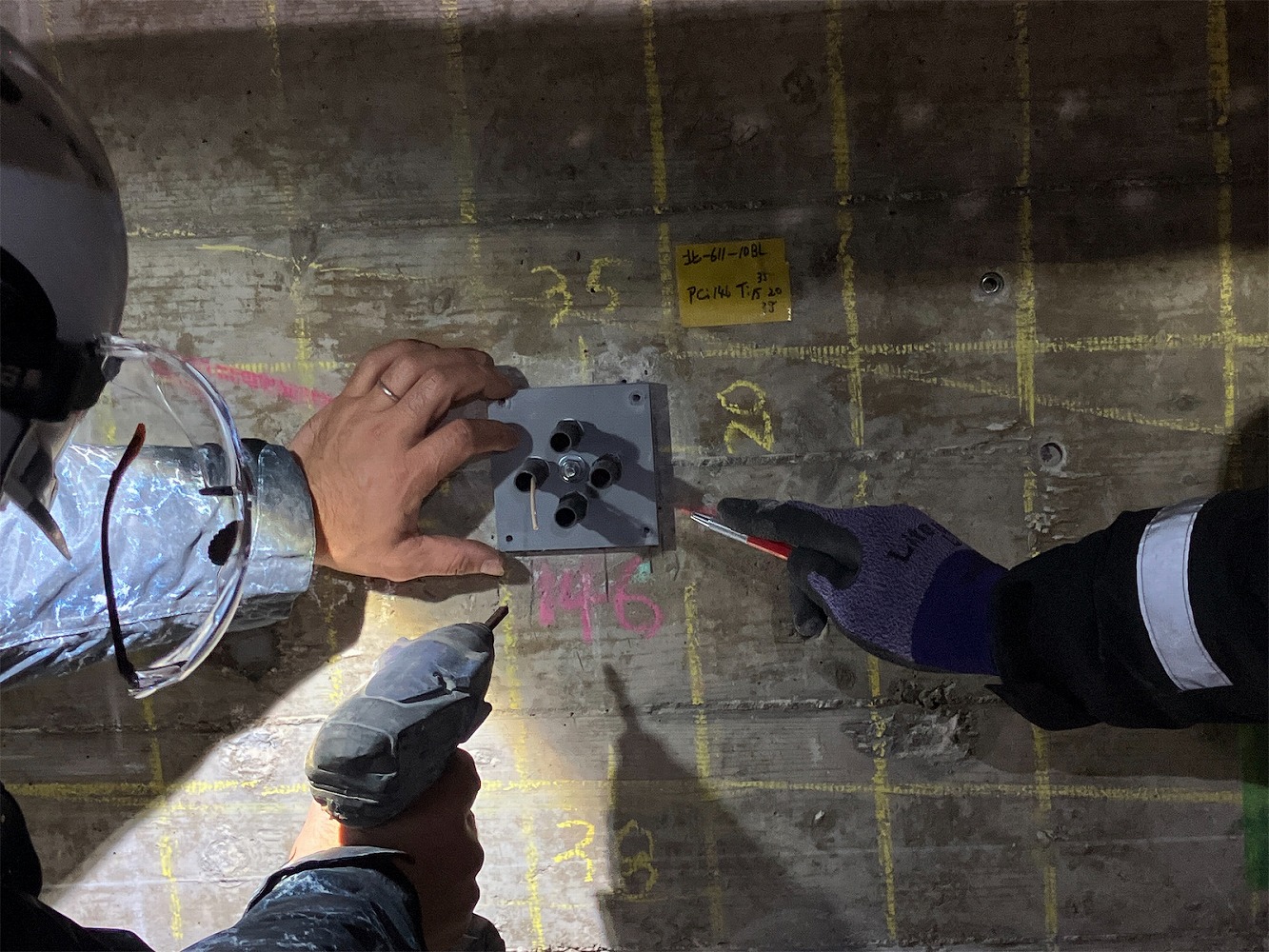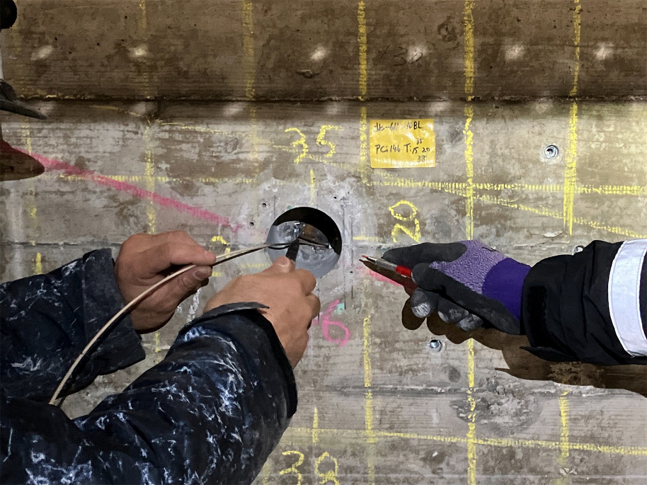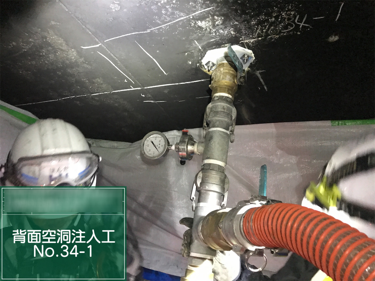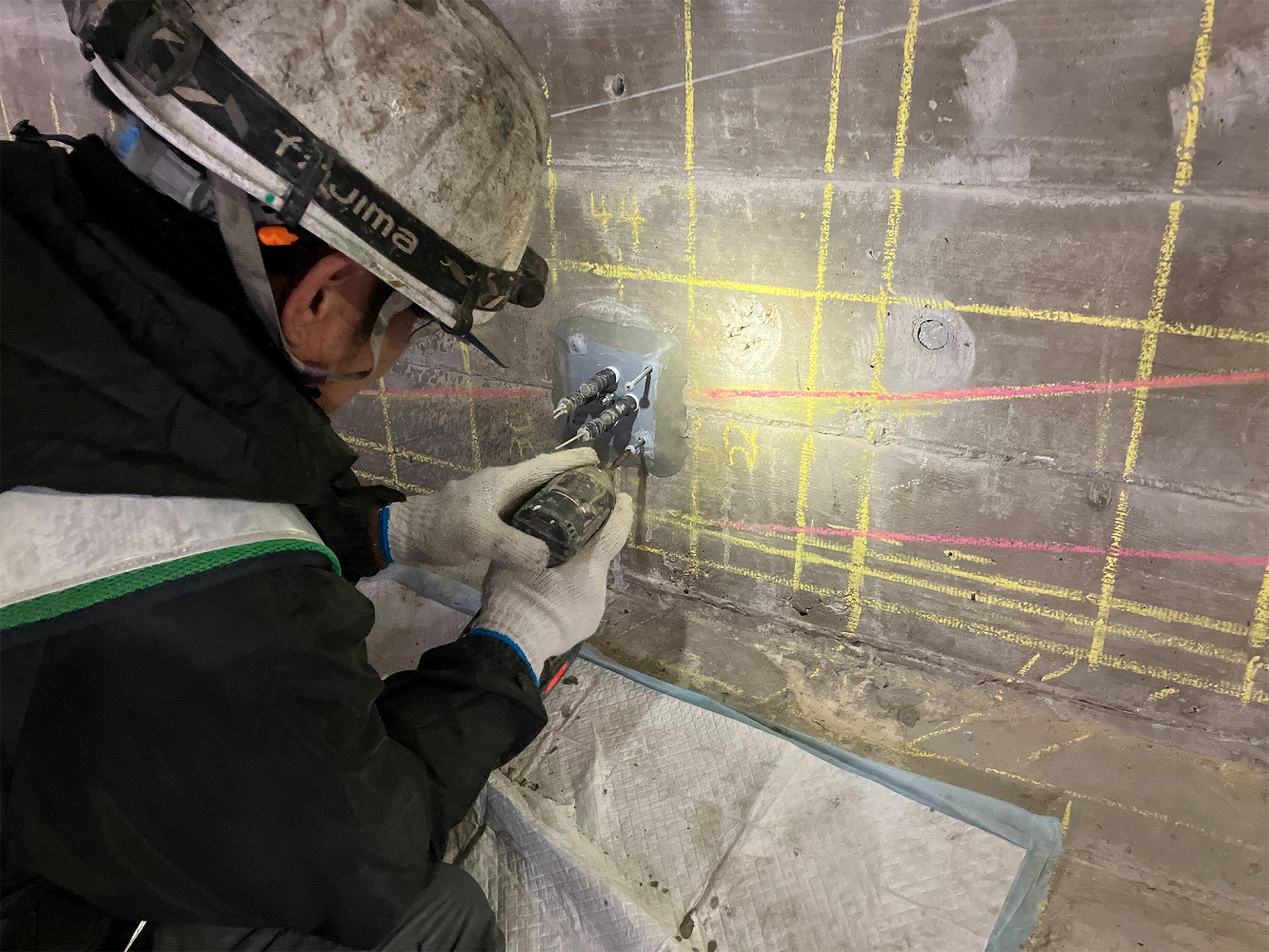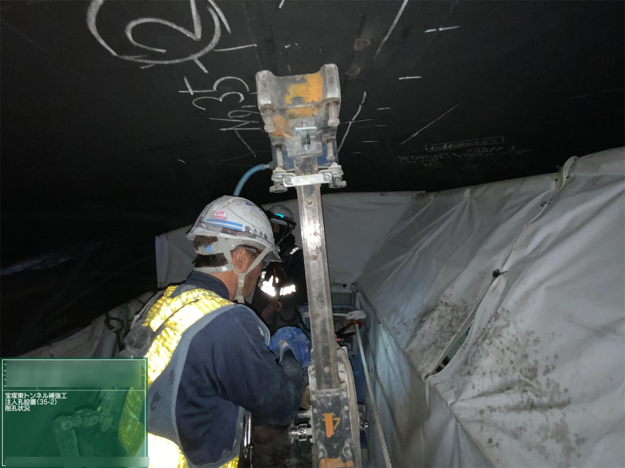 スペースパック工法によるトンネル補修①(注入口削孔状況)