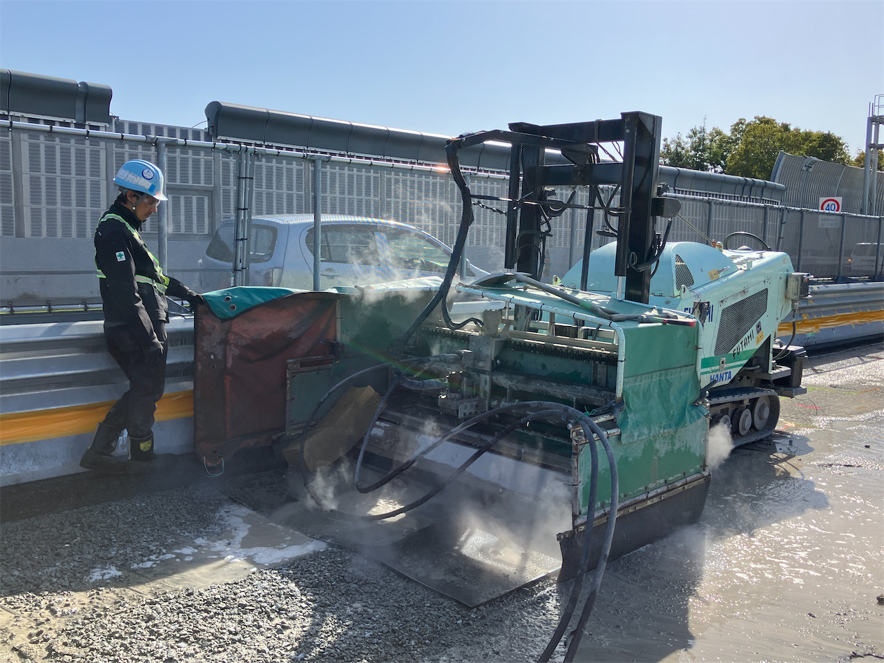 壁高欄の取替えについては、まず地覆部から上の部分をカッターで切断して、新しいプレキャスト壁高欄をアンカーで固定します。もう少し詳しく説明すると、床版レベルから地覆部立ち上がりまで数十ミリ上げた状況で切断し、WJで既設鉄筋を露出させた上で、新しいプレキャスト壁高欄をアンカー固定する方法です。壁高欄を据え付けた後に新しい環境シェルターを架設していきます。