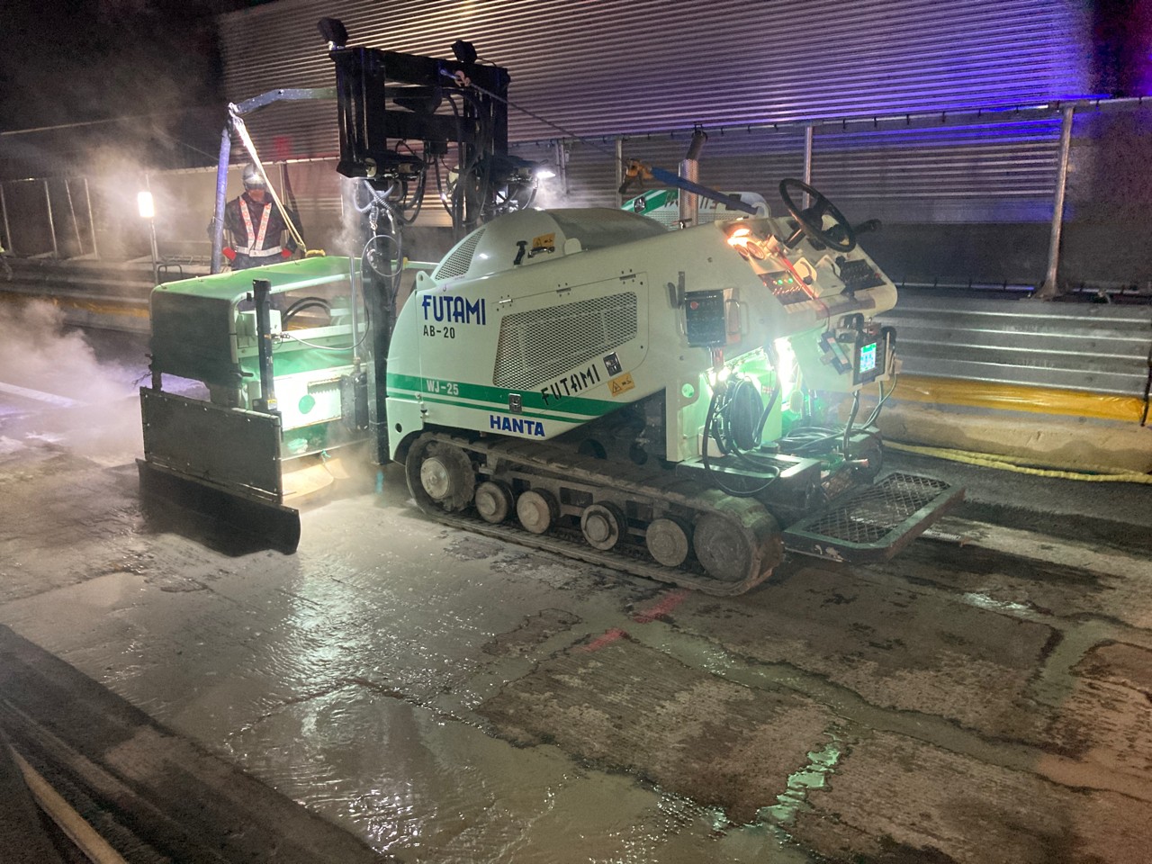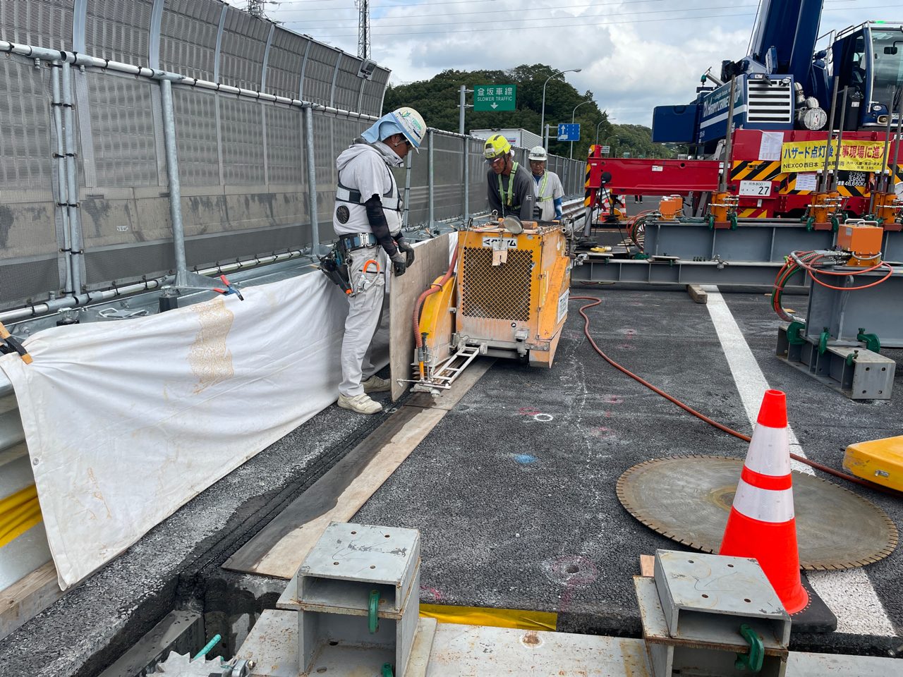 松井 上り線をR6.3~R6.4(追越側)、R7.2~R7.3(走行側)施工しました。下り線についてはR6.3~R6.4(追越側)に施工し、残る部分をR8.5~R8.6(走行側)で計画しております。既設床版界面の接着については、既設床版をWJ(アクアサーフェスクリーナー)で研掃し、プライマーを塗布しています。