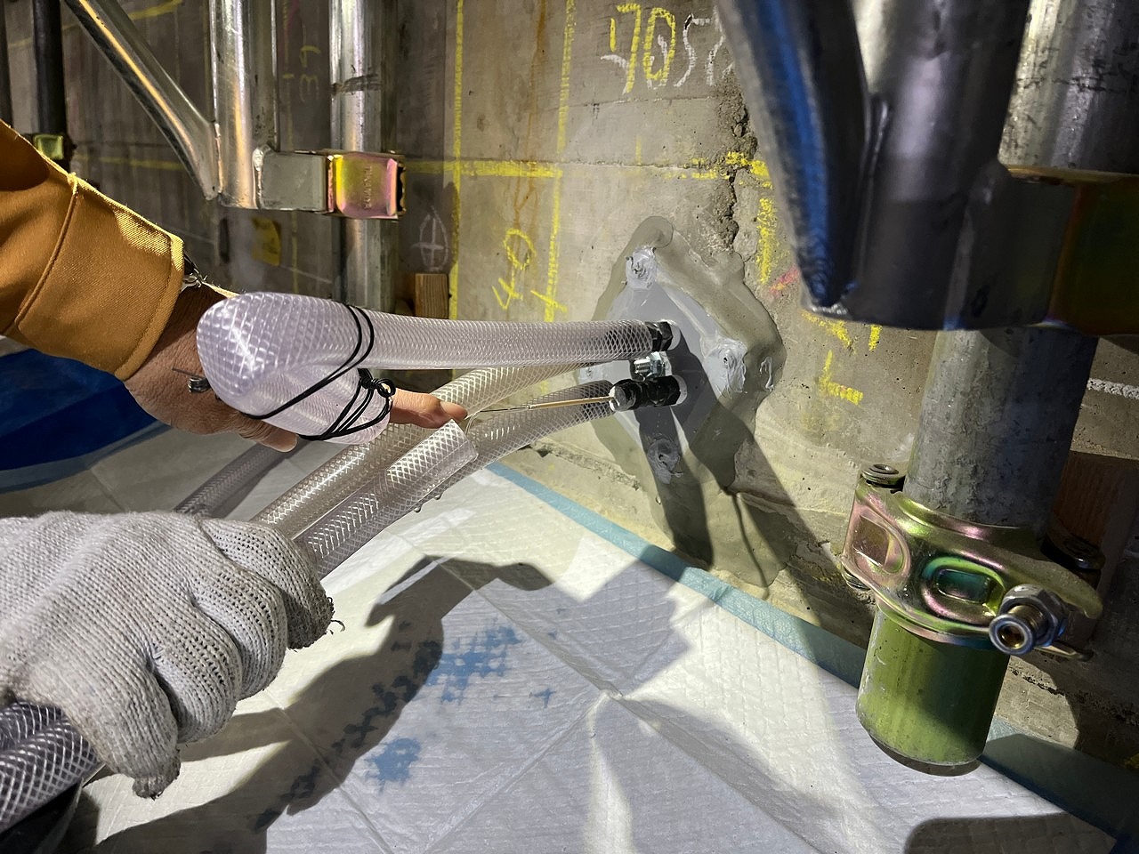 同③ (左)亜硝酸リチウム水溶液の除去、(中)補修材の注入、(右)同排出状況