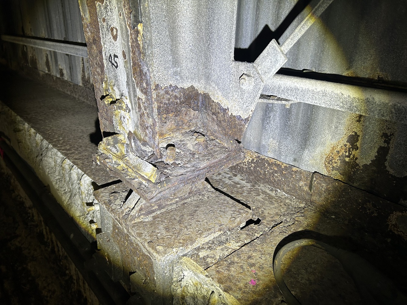 環境シェルターの損傷状況(ヒンジ構造の腐食)