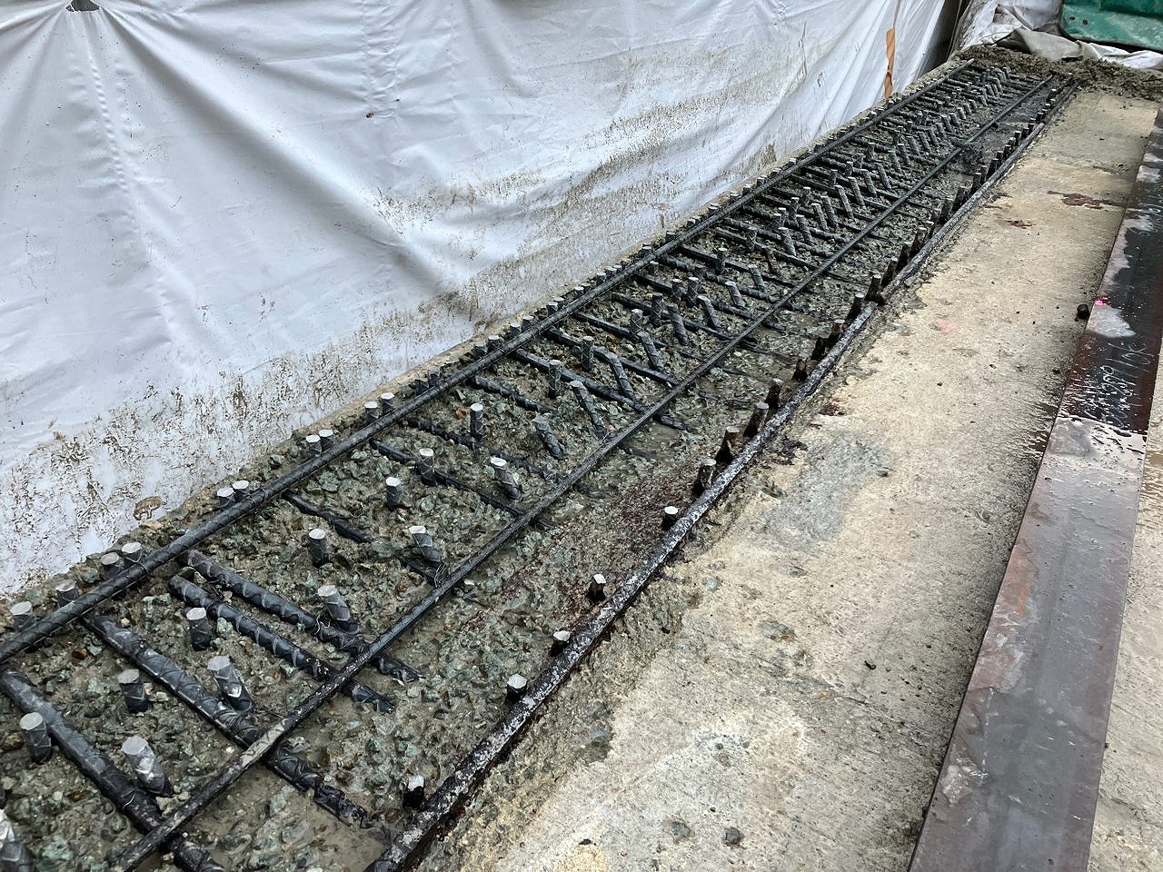 松井 有馬川橋(RC中空床版部)でUHPFRC (スティフクリート)による床版上面の補修を実施しました。RC中空床版の上面で鉄筋かぶりがほぼ無い状態の部分を補完する形で、UHPFRC による上面増厚を行いました。鉄筋の腐食は大きく進んでいませんでしたが、かぶり不足の対策として採用しました。