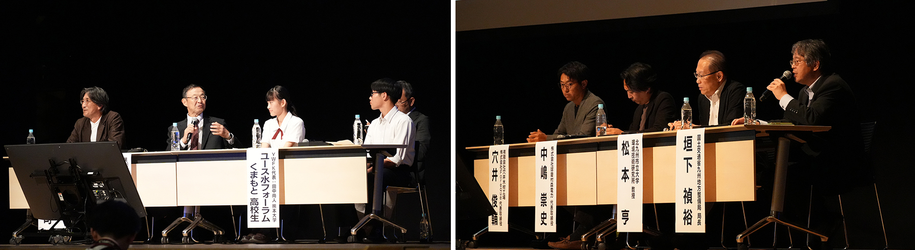 その後の全体討論会は「九州から考える土木イノベーションとカーボンニュートラル」をテーマに、産学官および高校生を交えた多角的な議論が展開された。コーディネーターは星野部会長、コメンテーターは池内会長が務め、パネリストには中嶋崇史氏(球磨村森電力 代表取締役)、穴井俊輔氏(穴井木材工場・Foreque 代表取締役)、松本亨氏(北九州市立大学環境技術研究所 教授)、垣下禎裕氏(国土交通省九州地方整備局 局長)、さらにユース水フォーラムくまもとから2名の高校生が参加した。星野部会長は「カーボンニュートラルは土木分野だけでは実現が難しい課題だが、多様な立場のパネリストが集まったこの討論会は、池内会長の講演で語られた社会課題をどのように“自分ごと化”するかを共有できる場となった」と述べた。