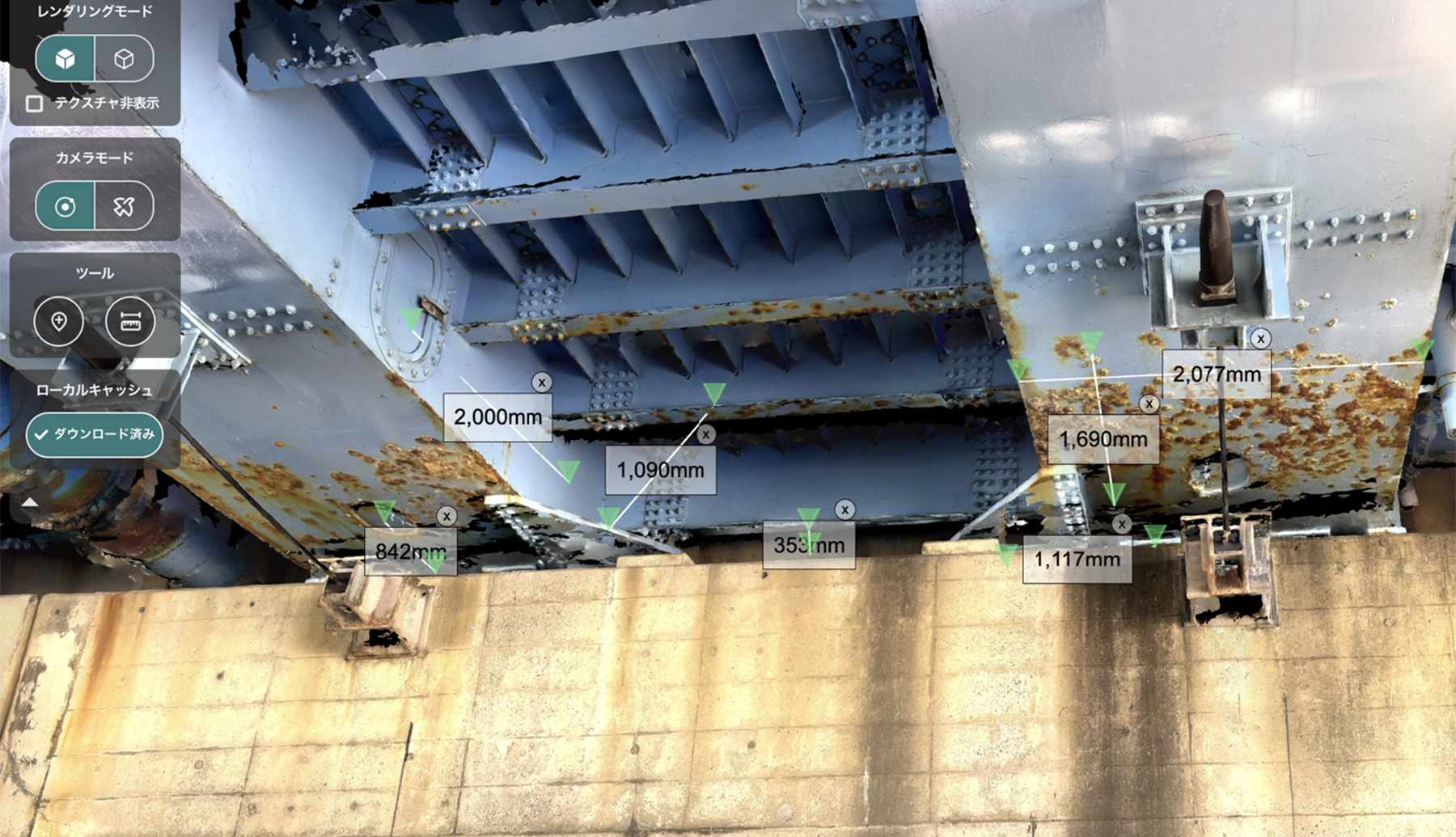 鋼橋の補修計画では、現地での詳細な採寸や点群測量などの工程が不可欠で、多くの工数と熟練技術を要してきた。同時に、鋼橋補修には関係⾃治体や地域住⺠、発注主、施⼯業者など多様なステークホルダーとの調整も必要で、それぞれに合わせた異なる説明資料(3D データ)を個別に作成することも⼯数のかかる作業である。⼀⽅、このような⼟⽊分野の専⾨家は減少し、作業員の⼈材確保も困難なのが現状だ。「3D.Core」を用いれば、現場で撮影した画像データをアップロードするだけでAIが自動処理を行い、翌朝には設計や補修塗装計画、足場計画に必要な3Dデータを閲覧・活用できる。高性能PCを用意せずとも、一般的なオフィス環境で操作可能な点も大きな利点である。
