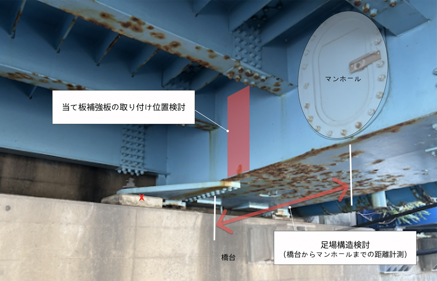 鋼橋の保守・補修作業前の検討ポイント例(⼀部画像は写真)