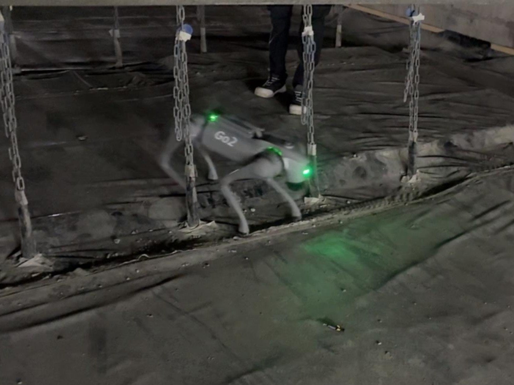 本試験では、Unitree Robotics社製の四足歩行ロボット「Go2」に独自プログラムを搭載し、実際に稼働している工事現場で自律走行を行った。吊り足場全般の特徴として、一枚の大きな床材ではなく、細かい床材の集合であるため軽微な段差が多く存在すること、また床材と構造物を繋ぐチェーンやワイヤーなど、LiDARで検知しにくい障害物があることが課題であったが、従来LiDARで検知しにくかった細い吊りチェーンを障害物として正確に認識し、接触することなく自律歩行をすることに成功し、悪路での安定歩行も確認した。