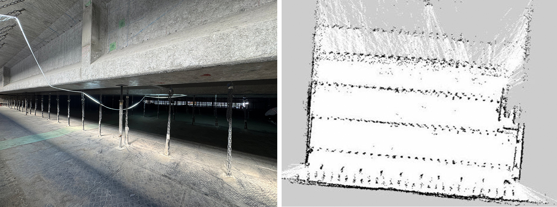 左:実証で使用した吊り足場環境、右:ロボットがLiDARで認識した環境